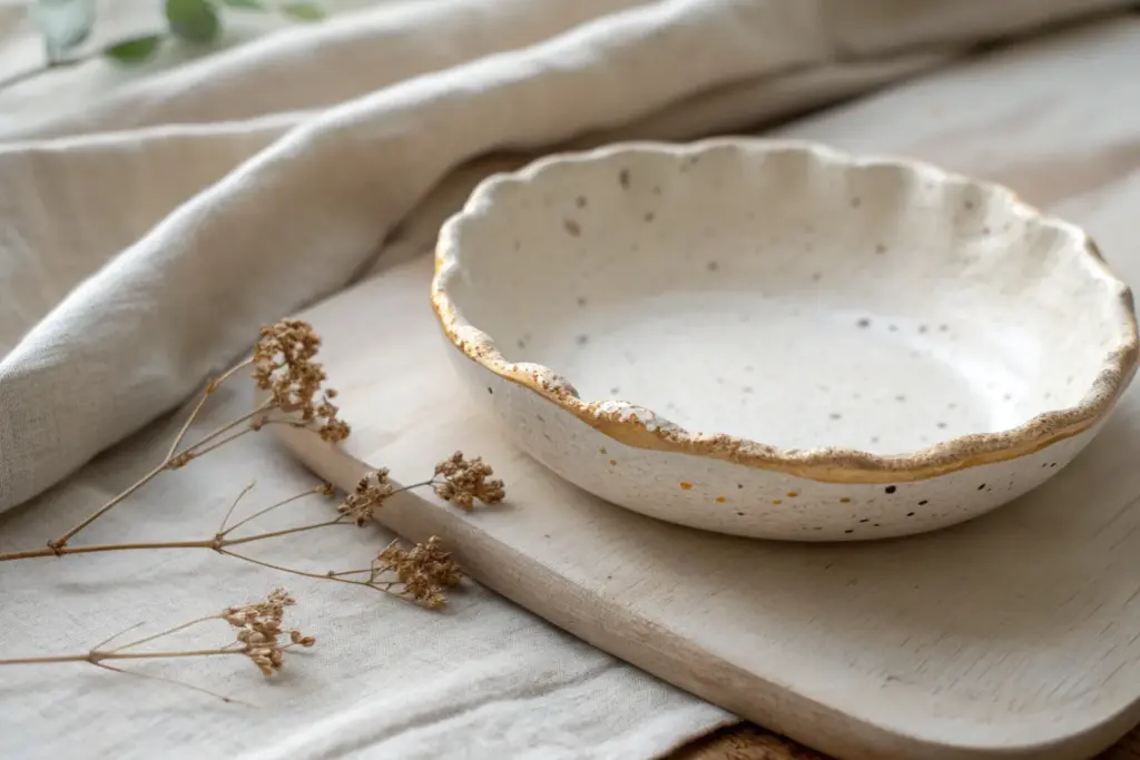 If your rim looks wavy while drying, gently sand it flat after the clay hardens. Placing the sandpaper on a table and rubbing the upside-down dish against it ensures a level top.