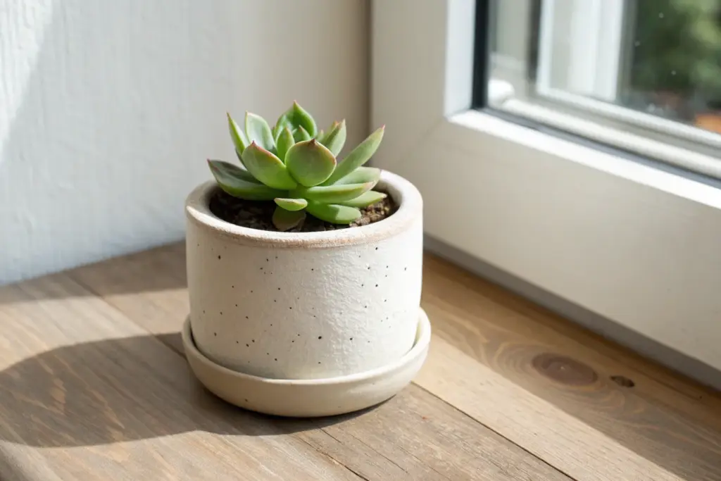 Mini pinch-pot succulent planter trio in soft neutrals for a sunny, minimalist shelf