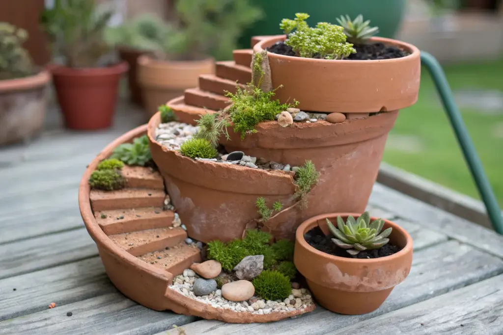 Turn pot shards into a tiny spiral staircase garden with succulents and pebble landing.
