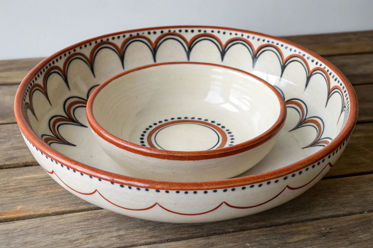 This contemporary chip-and-dip set balances rustic charm with modern color-blocking. The speckled cream interior keeps snacks looking appetizing, while the bold terracotta rim and deep forest green base create a grounded, earthy aesthetic.