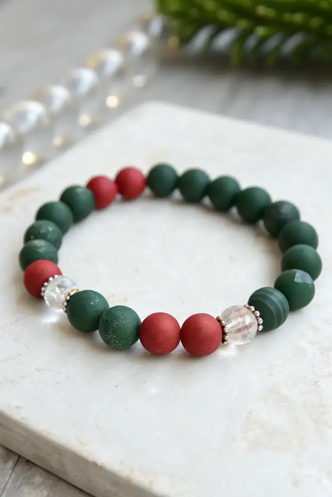Capture the festive spirit with this sophisticated winter bracelet that pairs velvety matte finish beads with sparkling crystal accents. The contrast between the deep evergreen, vibrant berry red, and icy clear quartzes creates a stunning holiday accessory that isn’t too loud.