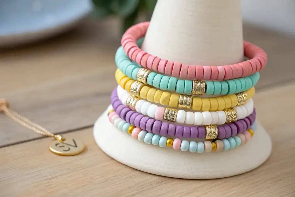 When I’m building a clay bead bracelet set, I think like a color chef—start with a tight color palette, then add just enough shine and texture to make the stack feel styled. Here are my favorite go-to set “recipes” for mixing heishi beads, gold spacers, letter beads, and charms into an arm stack that looks pulled together without trying too hard.