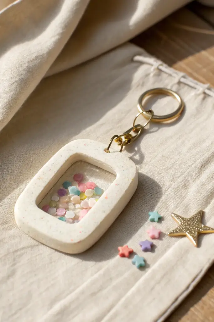 This whimsical keychain mimics the fun of a shaker toy, featuring a sleek, speckled frame encasing a tiny world of pastel confetti. The clear window creates a delightful rattle and movement, making it a perfect fidget-friendly accessory for your keys.