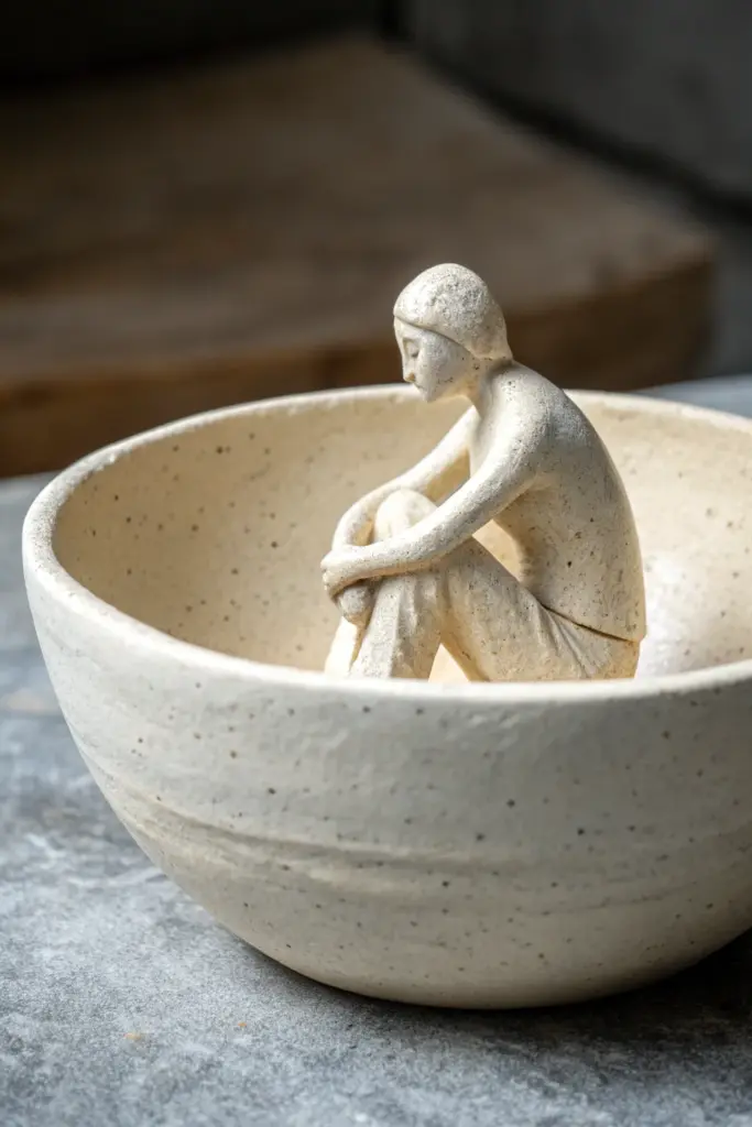 This serene ceramic project merges a functional bowl shape with a stylized human figure, creating a piece that feels both sculptural and intimate. The unglazed, speckled clay body gives it a raw, earthy texture that emphasizes the quiet emotion of the pose.