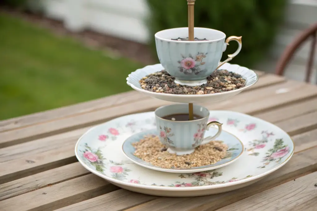 Transform mismatched or heirloom china into a stunning centerpiece perfect for afternoon tea. This elegant two-tiered stand combines delicate floral plates with gold hardware to create a functional piece of art for serving pastries and fruit.