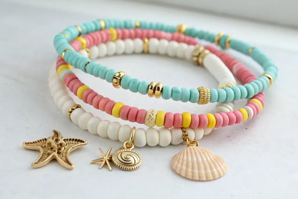 Whenever I’m craving a little ocean energy, I reach for clay bead bracelets in sunny colors that feel like sand-between-your-toes. These beach-themed ideas are my go-to mix of easy, cute, and totally stackable.