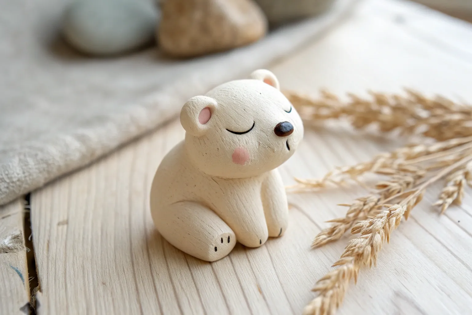 Tiny pebble clay animals in soft pastels, minimalist faces, and cozy Scandinavian styling