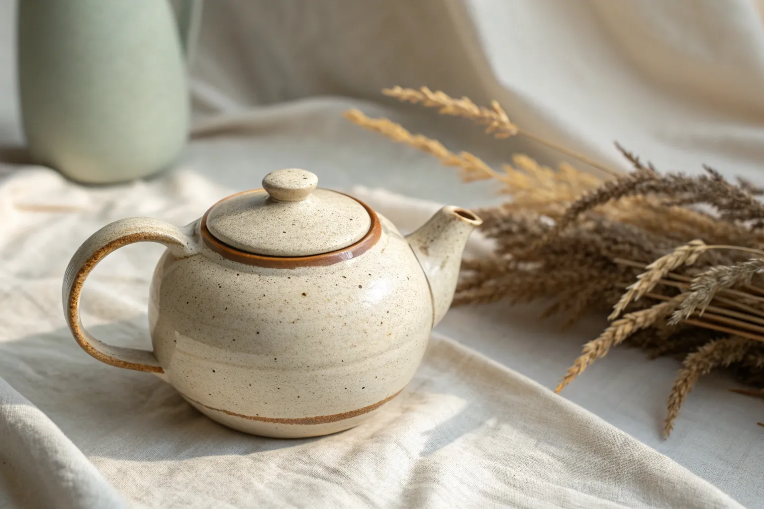 This charming, rustic teapot brings the serenity of a garden into your kitchen with its speckled sage green glaze and raised floral reliefs. The combination of earthy, unglazed clay at the base and delicate, hand-sculpted blossoms creates a tactile piece that feels both organic and refined.