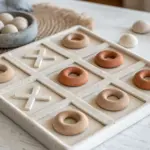 Minimal stackable clay tic tac toe set with hidden storage, perfect for cozy shelves