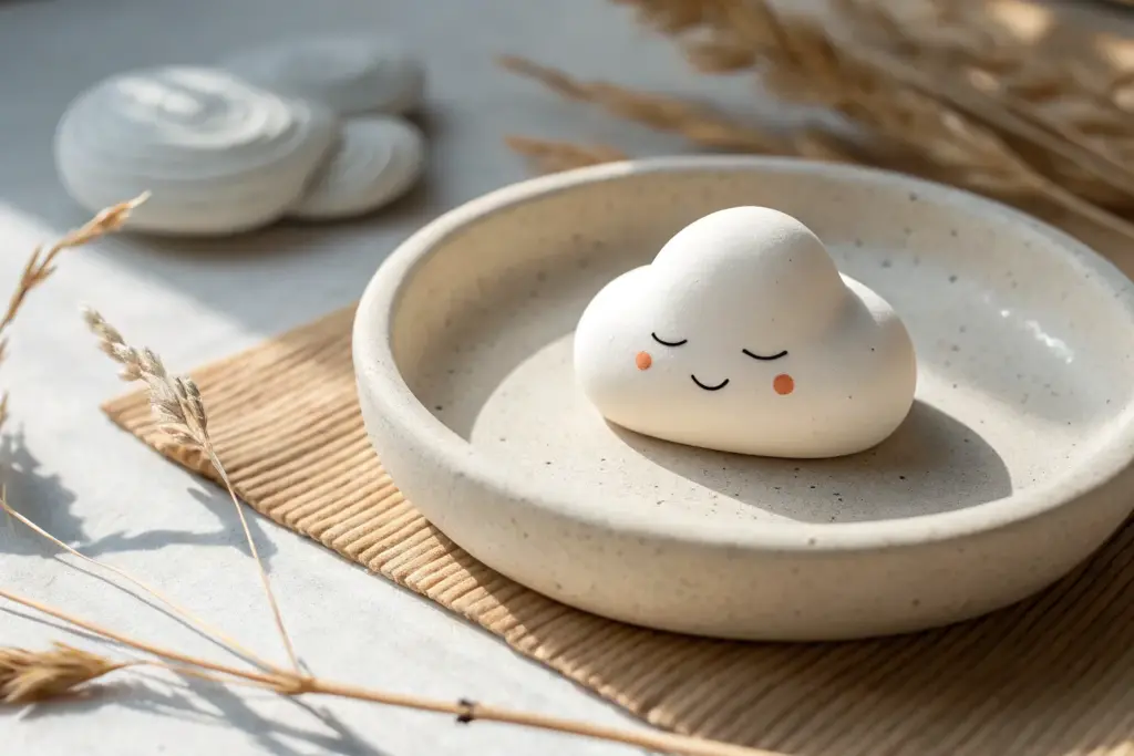 Simple dot-eyed clay cat with a curled tail, minimalist and cozy in a calm neutral setting