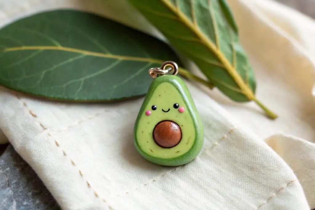 Adorable avocado best friend charms in green polymer clay, minimalist, sweet, and giftable.