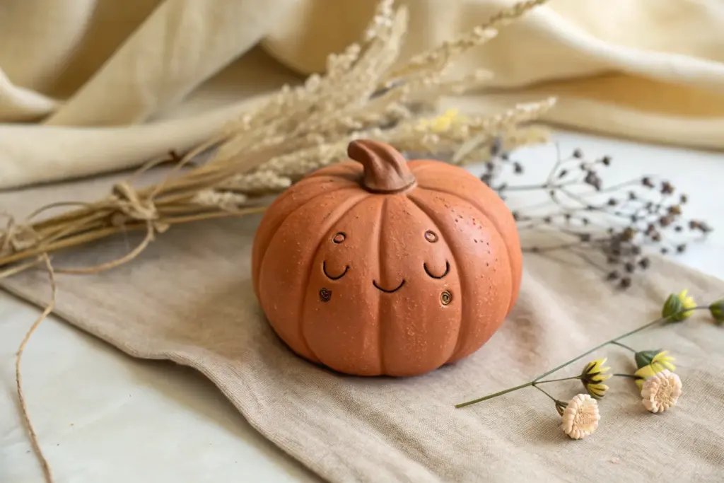 Create this charming set of miniature jack-o’-lanterns to add a touch of handcrafted whimsy to your Halloween decor. These tiny pumpkins feature expressive faces carved or painted onto vibrant orange clay, complete with realistic green stems.