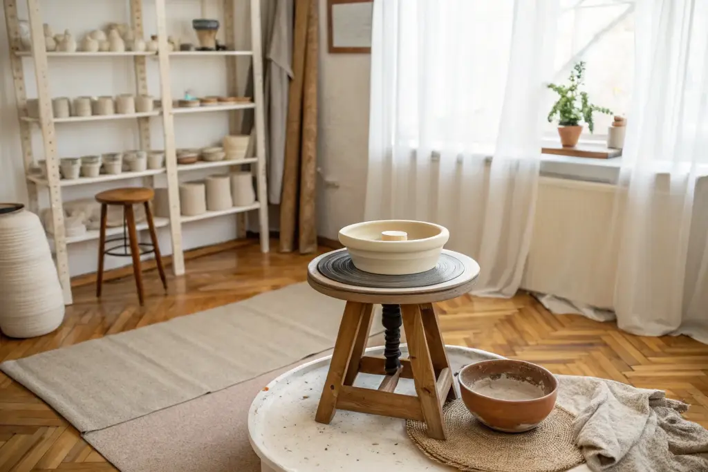 Keep a large ceramic bowl or bucket of water on the floor nearby for easy cleanup and wheel lubrication, styling it to match your studio pottery.