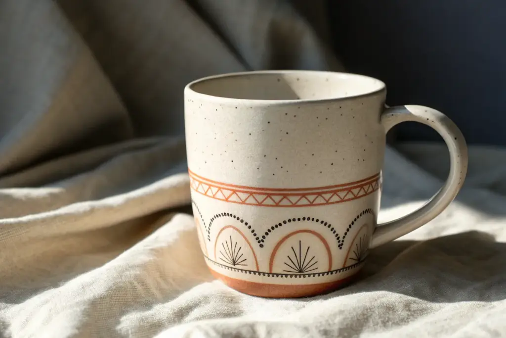 This project captures the warmth of vintage pottery with a modern, minimalist twist using simple horizontal bands. The combination of clean black lines, rust-orange accents, and textured cream glaze creates a cozy, handcrafted feel perfect for your morning coffee.