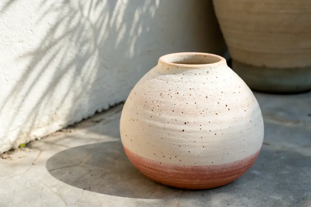 Pour a matte cream glaze inside the vase, swirl to coat, and pour out the excess. For the exterior, dip or brush the glaze evenly. To get that speckled look, ensure your clay body has grog or iron specks that will bleed through, or use a specifically speckled glaze.