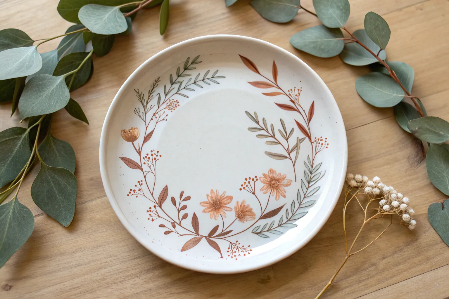 - Ceramic paints or porcelain markers (colors: terracotta, sage green, mustard yellow, teal blue, pale pink)
