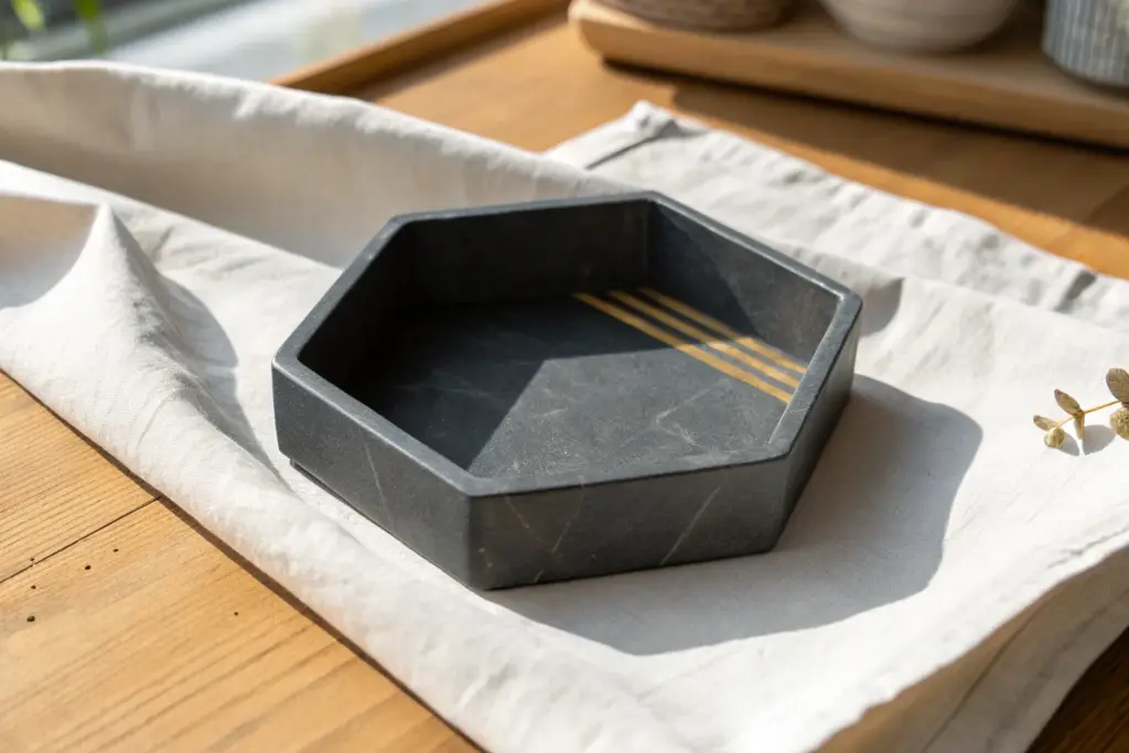 This sleek, masculine valet tray mimics the weight and texture of dark granite without the need for heavy stone-cutting tools. Its geometric hexagonal shape and speckled finish make it the perfect minimalist catch-all for keys, coins, and everyday carry essentials.