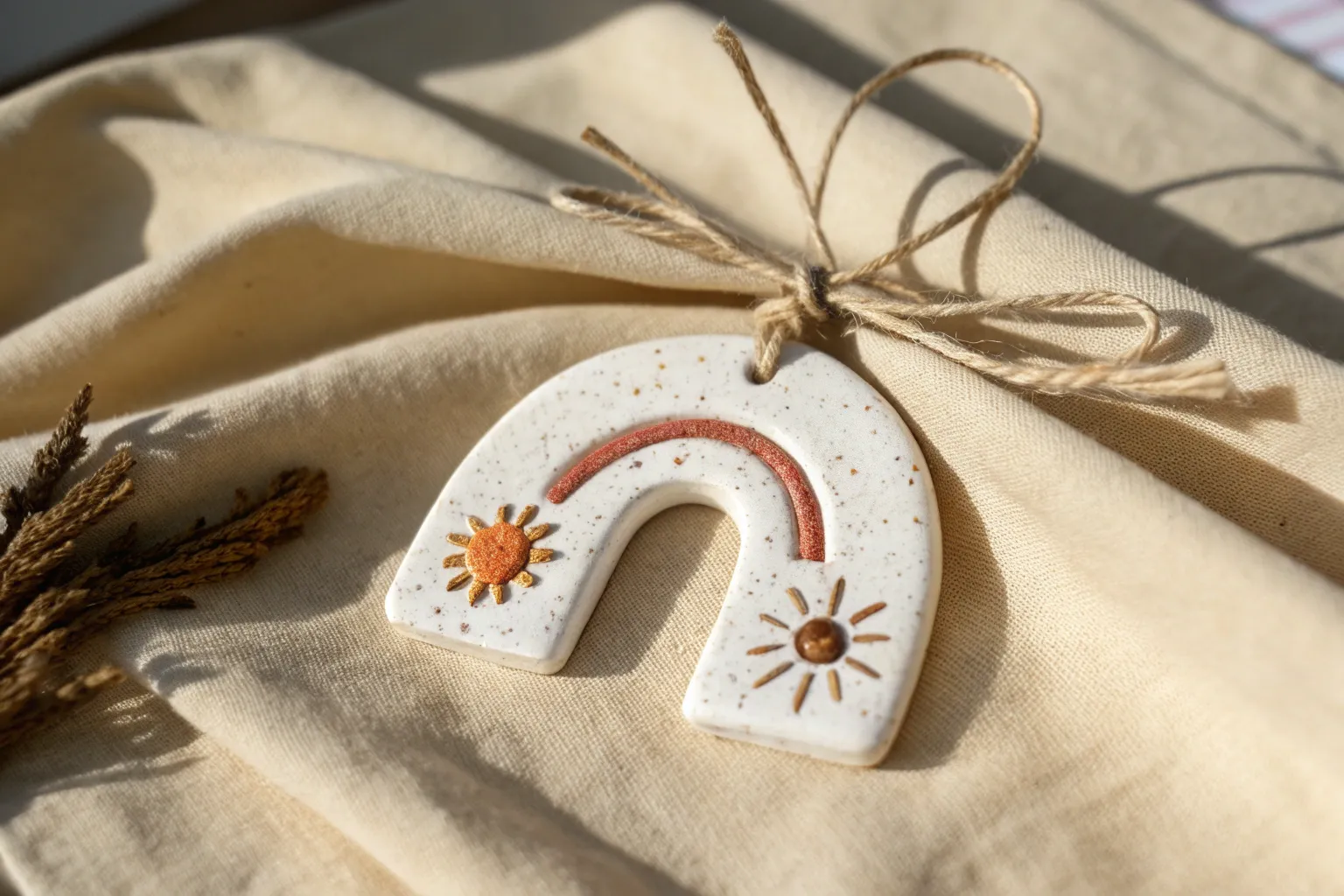 Minimal star and tree polymer clay ornaments with linen ribbon on a pine branch