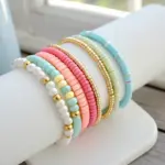 These breezy bracelets combine the classic preppy aesthetic of white heishi discs with soft pops of pastel pinks, mint greens, and rich gold accents. The mixed textures of flat clay beads and smooth round beads create a layered look that feels polished yet effortless for everyday wear.