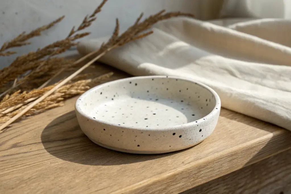 Embrace the beauty of imperfection with this minimalist trinket dish that mimics the look of natural speckled stone. Its organic shape and subtle texture make it the perfect resting place for your favorite jewelry pieces.