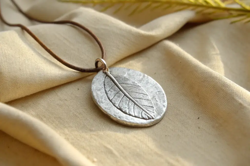 Capture the delicate details of nature forever with this rustic silver pendant. By pressing a real leaf into metal clay, you can create a one-of-a-kind piece of jewelry that highlights every vein and contour with stunning clarity.