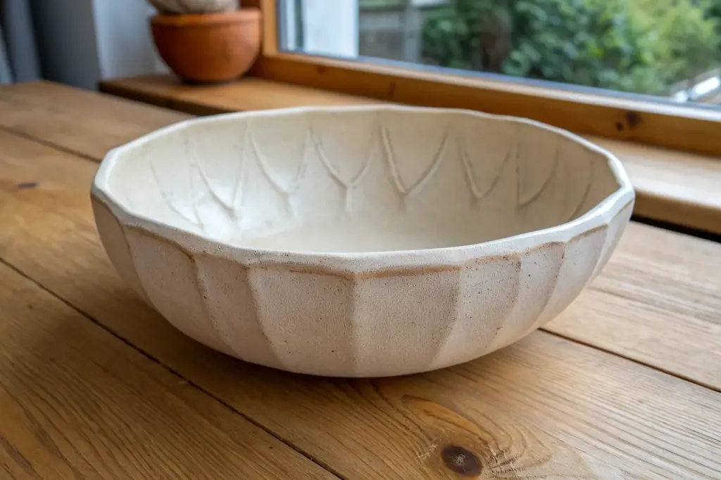 Dip or brush your bowl with a matte, creamy white glaze. The matte finish helps absorb light softly, emphasizing the subtle textures you created. -