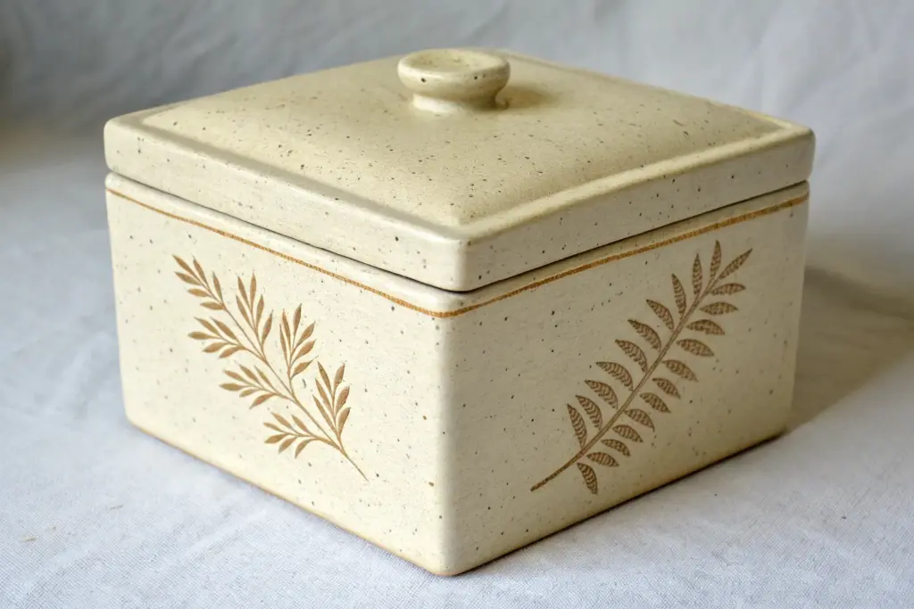 This charming project features a clean, rectangular lidded box perfect for storing butter or small treasures. Its glossy white glaze and warm, exposed clay edges give it a timeless, modern farmhouse aesthetic.