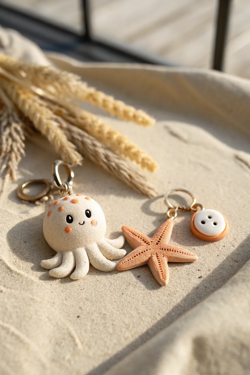Bring the ocean to your keychain with these adorable polymer clay charms featuring a blushing octopus and a textured starfish. These miniature creations have a soft, sandy finish that makes them perfect little companions for your beach tote or backpack.