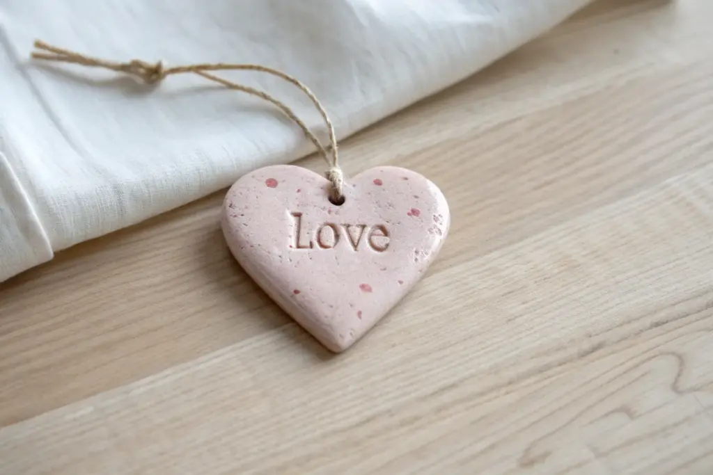 Minimal clay heart tag with twine beside a wrapped Valentine gift, soft boho Scandinavian feel.