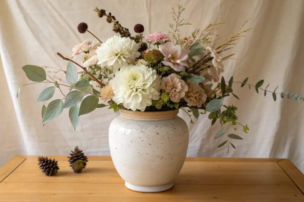 Transform a simple rustic vase into a stunning botanical display by mastering the art of the greenery framework. This approach uses the natural drape of eucalyptus and dried stalks to create a supportive structure before any focal flowers are added.